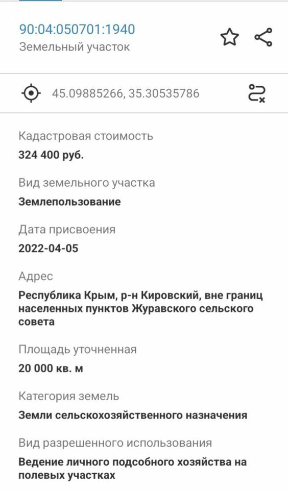 Продам земельный участок - с/х использование. Участок 2 га.Так же можно отдельно приобрести 1.4 гектара 90:04:050701:1942. Дополнительно ещё 2 гектара в продаже 90:04:050701:1941. Так же можно приобрести участок 2 гектара 90:04:050701:1954.